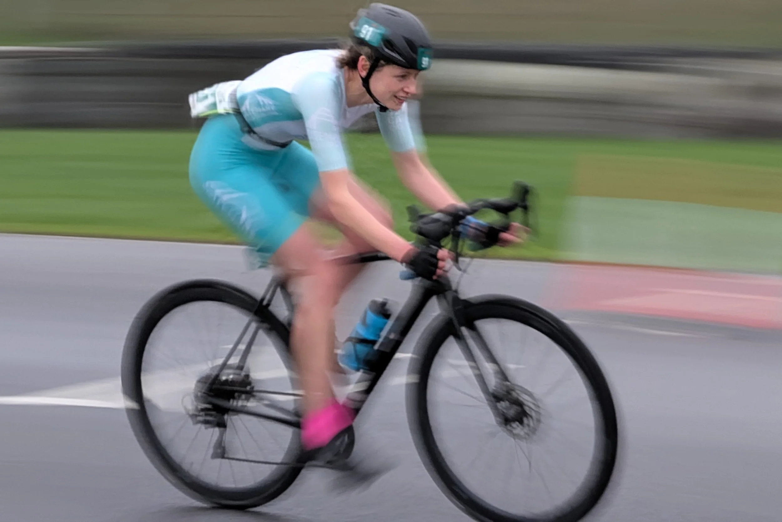 I recognised the athlete, Karina, from other duathlon races that I had been to, and we rode together for the first lap, taking turns to draft off each other. We slowed down at a chicane near the end of the first lap, Karina got ahead, and I was unable to catch her up. I rode on my own for a while, then another athlete, who I also recognised, called Erica, joined me, and we drafted off each other for the rest of the race. We weren’t allowed to draft off men or athletes on a different lap to us, so we had to be careful to keep an eye on who was around us and not be tempted to join the group of fast women when they came past on their last lap!